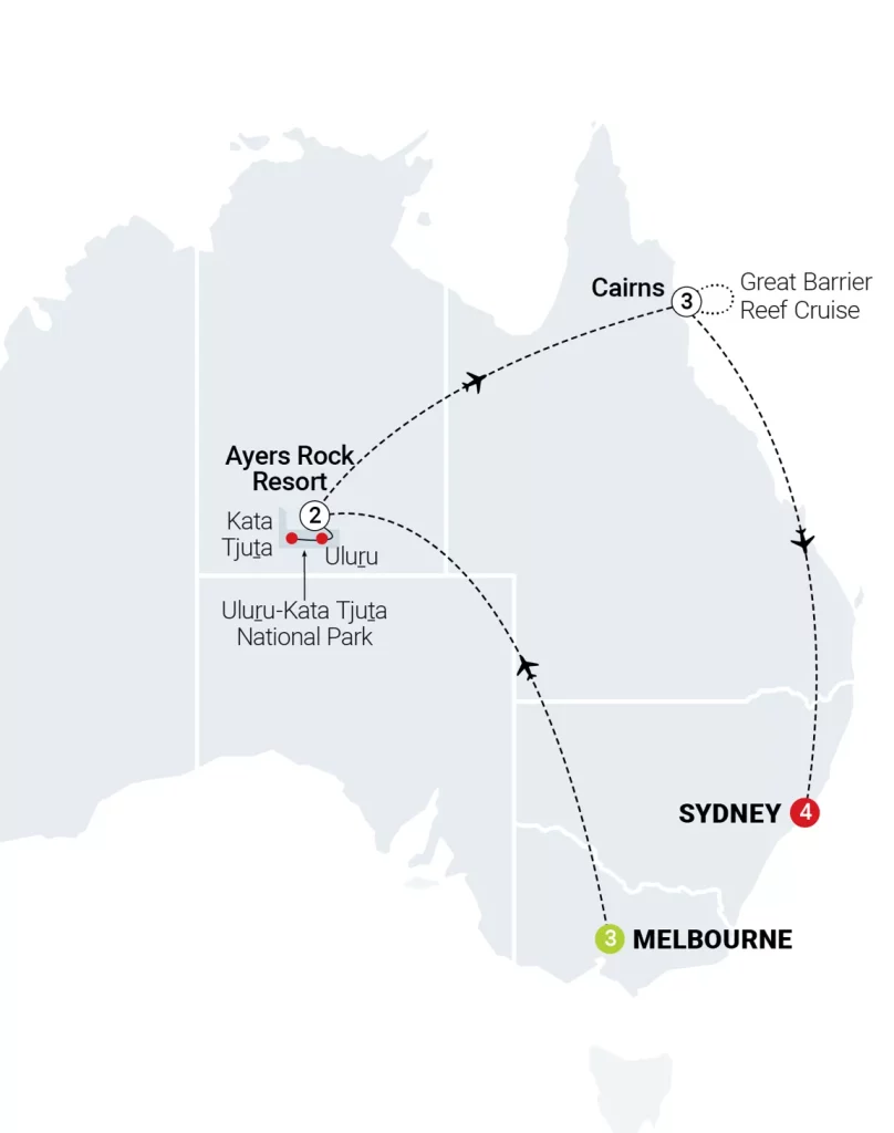 Koe Australian parhaat puolet kokeneen englanninkielisen matkanjohtajan ja kuljettaja-oppaan johdolla. Tutustut uskomattomiin paikkoihin, matkustat mukavalla linja-autolla ja asut tasokkaissa hotelleissa. Ohjelma on tasapainoinen kokonaisuus käsittäen nykyaikaiset kaupungit ja upeat luontokohteet. Värikäs Iso valliriutta, Punaisen keskustan aboriginaalikulttuuri ja opastettu käynti Sydneyn oopperatalossa ovat matkan kohokohtia.