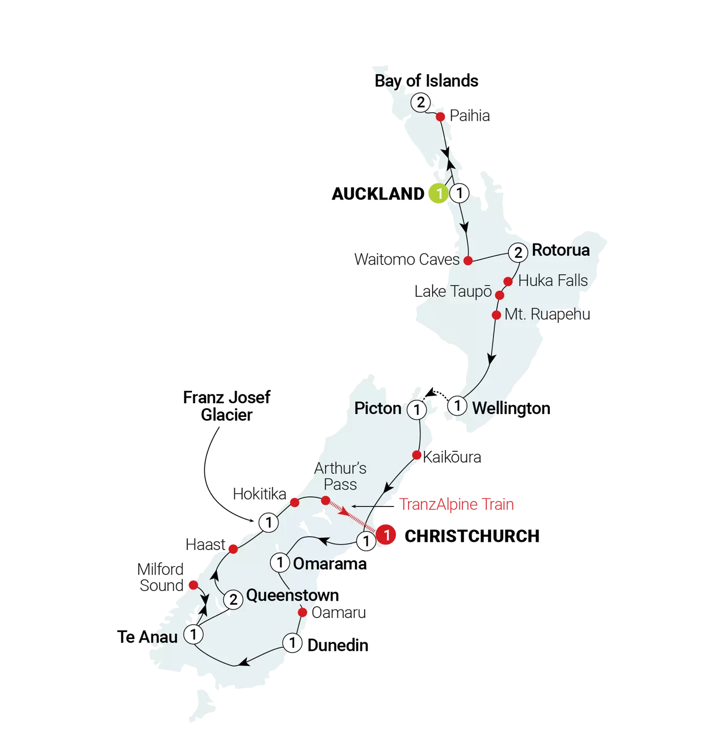 Tämän aamun ensimmäinen kohde on Hokitika, joka on tunnettu jadestaan. Matka jatkuu Arthur’s Passiin missä noustaan legendaariseen Tranz Alpine -junaan joka kulkee Eteläisten Alppien poikki Christchurchiin. Illalla nautitaan jäähyväisillallinen matkanjohtajan ja kanssamatkustajien seurassa.