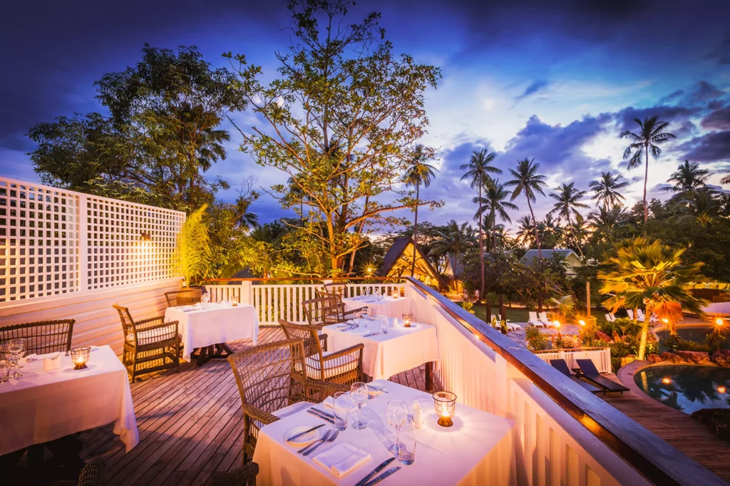 Saarella on useita ravintoloita ja baareja, jotka tarjoavat vaihtelevia ruokailuelämyksiä rennosta saariruokailusta hienostuneempiin illallisiin. Listoilla on paljon tuoreita raaka‑aineita ja trooppisia makuja, ja kaikki ateriat nautitaan merinäköalojen ympäröimissä ravintoloissa. Aamiainen on monipuolinen ja tarjoaa sekä kevyitä että runsaita vaihtoehtoja päivän aloitukseen.