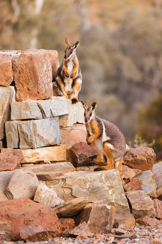 Flinders Rangesin alueella asuu kymmeniä emuja ja kenguruja, jotka liikkuvat avoimilla tasangoilla näkyvästi. Aamun ja illan valossa ne voi nähdä helposti jopa lyhyen ajomatkan aikana.