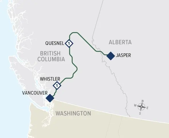 Vancouver – Whistler – Quesnel – Jasper (matkan voi tehdä myös päinvastaiseen suuntaan)
