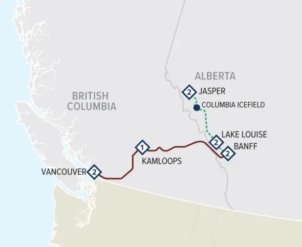 Vancouver – Kamloops – Lake Louise/Banff (matkan voi tehdä myös päinvastaiseen suuntaan)